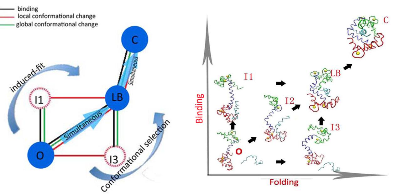 图像为:非典型“诱导拟合”,非典型“构象选择”和“同时结合折叠”的混合的能量地貌