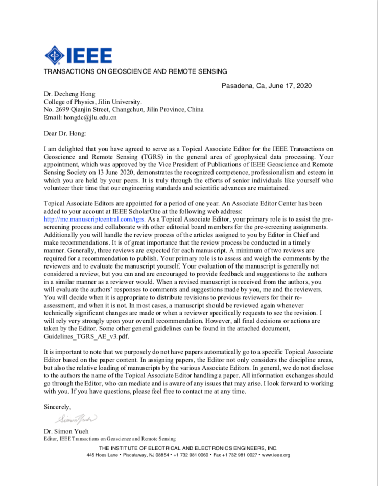 洪德成教授被美国电气和电子工程师协会 (Institute of Electrical and Electronics Engineers,IEEE) 正式任命为旗下学术期刊IEEE Transactions on Geoscience and Remote Sensing(TGRS)副主编。