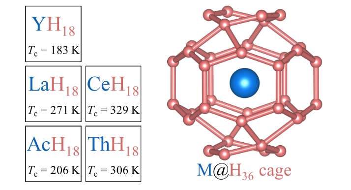 本工作利用CALYPSO结构预测软件结合第一性原理计算,在400 GPa的条件下系统计算了镧系和锕系金属富氢化合物,提出了新型富氢笼型结构MH18(M=镧系或锕系金属元素)化合物,其中ThH18和CeH18在高压下(350-400 GPa)的超导温度可达室温。当前研究为在高压下寻找和设计新型室温超导体提供了新思路。