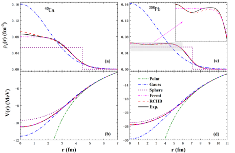 图一:理论电荷密度(RCHB和部分经验电荷分布模型)和实验结果对比,以及相应的静电势的比较。图中红色虚线为RCHB理论给出的结果,黑色实线为弹性电子散射实验给出的结果。 |