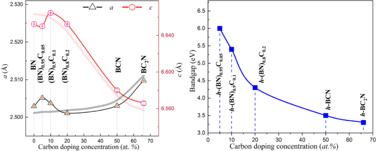 左图:B-C-N化合物的晶格常数随C掺杂量的变化;