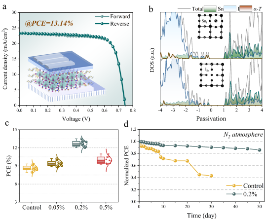 针对上述问题,王宁教授研究团队提出一种由天然维生素E(α-生育酚)诱导的表面缺陷钝化策略。通过将α-生育酚引入到锡基钙钛矿前驱体溶液中,利用添加剂分子与前驱体成分之间的分子间相互作用力,他们成功地延缓了锡基钙钛矿的结晶速率,提高了薄膜质量,从而达到了抑制表面缺陷的目的。实验结果显示,由于α-生育酚分子体积较大,所以无法进入钙钛矿晶格,而是分别与钙钛矿末端的甲脒阳离子(FA+)和[SnI6]4-八面体之间形成范德华相互作用和氢键相互作用。这种分子间相互作用力,显著改善了钙钛矿薄膜的形貌,降低了薄膜内部的氧化行为和带隙中深能级缺陷的形成。通过DFT理论计算分析,作者证实了在带隙内具有深阱态的I-Sn反位缺陷(ISn)和Sn间隙缺陷(Sni)被有效抑制。最终,作者成功制备了功率转换效率(PCE)达到13.14%的锡基PSCs,并将锡基PSCs的寿命延长到50天以上。这项研究通过引入α-生育酚,利用其与钙钛矿前驱体的分子间相互作用力,有效延缓了Sn基钙钛矿的结晶过程,减少了表面缺陷的形成。此外,对深能级缺陷的抑制也为提高太阳能电池性能和稳定性提供了理论支持。最终实现了Sn基PSCs性能的显著提升,为其在实际应用中的进一步推广打下了坚实基础。