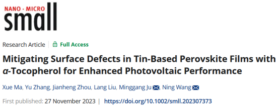 凝聚态物理系王宁教授团队在锡基钙钛矿太阳电池(PSCs)研究方面取得重要进展,相关成果以“Mitigating Surface Defects in Tin-Based Perovskite Films with α-Tocopherol for Enhanced Solar Cell Performance”为题发表在国际知名学术期刊《Small》(DOI:10.1002/smll.202307373)。
