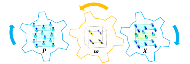 图1 氧化铪材料中的ωPX三线性耦合示意图。其中,氧亚晶格的ω畸变模式衍生出电矩反对称和对称各向异性交换作用。