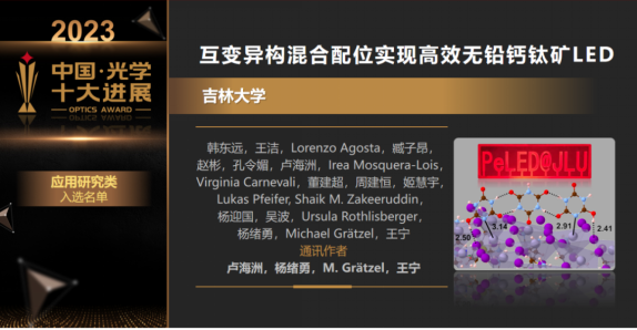 王宁教授团队发表在Nature上的论文“Tautomeric mixture coordination enables efficient lead-free perovskite LEDs” [Nature, 622,493-498 (2023)]入选“2023年中国光学十大进展(应用研究类)。该研究由王宁团队联合东南大学卢海洲、上海大学杨绪勇、洛桑联邦理工博彩App