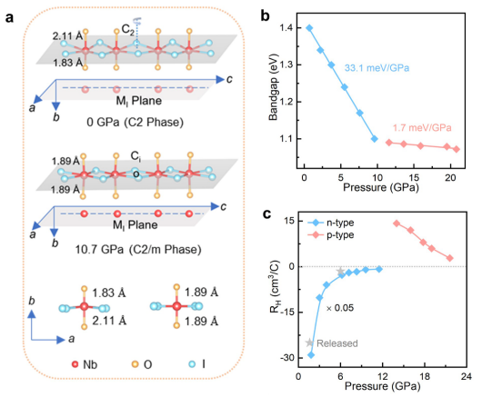 图1:通过压力抑制Nb原子沿着b轴的偏心,导致NbOI2发生C2到C2/m的半导体-半导体相变,同时,载流子行为发生从n型到p型的显著转变。