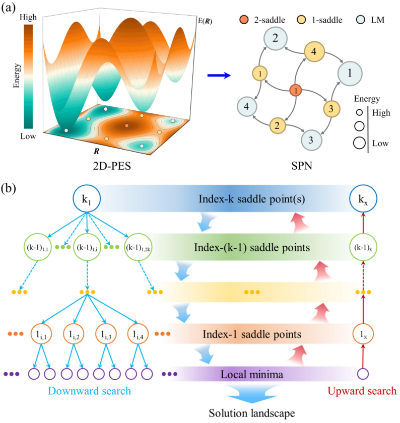 图 1 (a)势能面(PES)和驻点网络图(SPN)示意图;(b)晶体解景观示意图