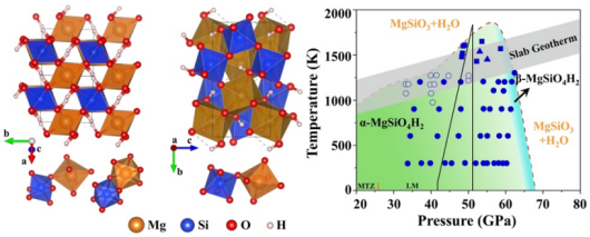 地球内部的水循环在地球演化和动力学过程中具有至关重要的作用,是长期以来备受关注的科学问题之一。地表水通常通过板块俯冲进入地球内部,其主要载体是俯冲板片中的含水矿物,包括镁硅酸盐含水矿物、FeO₂Hx和δ-AlOOH等。特别是MgSiO4H2,由于其具有较宽的温压稳定区间,被认为是地球内部水输运的关键载体。然而,MgSiO4H2的晶体结构一直未被确定,这阻碍了对地球深部水循环过程的深入理解。