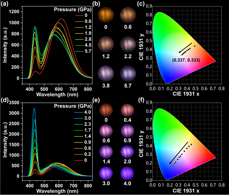 在过去的几十年中,发光二极管的制造和应用取得了快速发展,具有高光致发光量子产率和高单色性的材料成为固态照明的理想选择。然而,纳米晶体中的缺陷会导致表面缺陷发射和非辐射跃迁,从而降低材料的发光性能。压力工程作为一种有效的调控策略,可以大大缩短原子间距离,改变键合模式,从而创制出常规条件下无法获得的新材料。