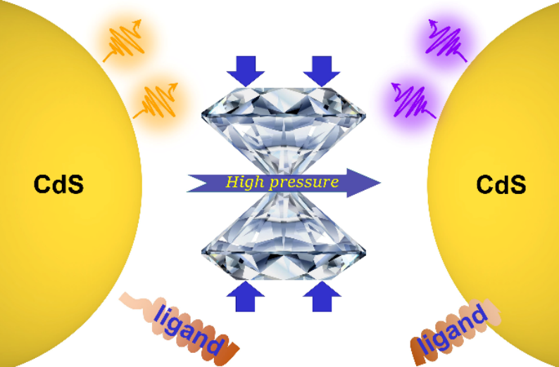 在本工作中,以传统半导体CdS纳米晶体为研究对象,高压下CdS纳米晶体从橙色发射转变为高质量的白光发射。进一步地,当在CdS纳米晶体中引入额外Z型油酸镉配体后,发光颜色在高压下从橙色转变为蓝紫色。主要归因于油酸镉配体包覆的CdS 纳米晶体在压力处理过程中本征发射显著增强,同时表面缺陷发射逐渐降低。结合系统的高压原位光谱研究和密度泛函理论计算,揭示了压力增强配体与CdS纳米晶体之间相互作用,从而促进了缺陷钝化和发光性能的调控与提升。该研究证实压力协同配体工程在调控纳米材料发光性质中的具有重要作用,为通过配体定向选择和纳米材料设计,进而精确控制压致变色和高效发光铺平了道路。