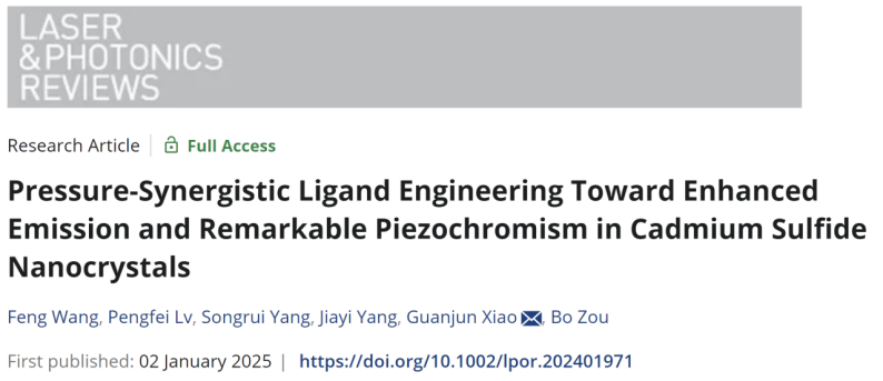 超硬材料国家重点实验室的肖冠军教授等人在CdS纳米晶体的发光调控研究中取得了重要进展。通过压力协同配体工程,成功实现了CdS纳米晶体在不同压力条件下的发光颜色转变,为半导体材料的光致发光性能提升提供了新的策略。相关研究成果以“Pressure-Synergistic Ligand Engineering Toward Enhanced Emission and Remarkable Piezochromism in Cadmium Sulfide Nanocrystals”为题发表在《Laser & Photonics Reviews》上。