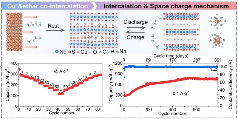 针对上述问题,杜菲教授团队在过渡金属二硫化物(TMDs,MX₂,其中M代表Ti、Nb和Ta,X代表S和Se)中观察到一种Cu-溶剂自发共插层过程,并在电化学循环中解锁了一种全新的插层和空间电荷离子存储机制。这种独特机制通过将Na离子插层到TMDs的层状晶格中,以及在放电过程中形成的Cu纳米颗粒表面通过空间电荷机制吸附大量Na离子,实现了高效的离子存储。这一独特机制赋予了材料705 mAh g⁻¹的高比容量,在75 A g⁻¹的极高电流密度下仍可维持116 mAh g⁻¹的比容量,以及超过一年的超长循环寿命。当与NVP正极材料配对时,全电池展现出优异的倍率性能,能够在256.4 C的极高倍率下运行,并具备高达17453 W kg⁻¹的高功率密度。其耐用性同样出色,在10 A g⁻¹的高电流密度下可稳定循环超过53000次。这种插层和空间电荷化学机制不仅显著提升了NbS₂的性能,还进一步增强了其他TMDs材料,如NbSe₂、TiS₂和TaS₂的卓越性能。这得益于插层机制的出色可逆性与空间电荷反应的高容量和超快动力学的完美结合。研究人员坚信,这种开创性的机制可以推广到广泛的插层材料中,并为锂离子电池、钾离子电池等其他类型的离子电池提供了新的设计思路。这不仅为开发具有新型电池氧化还原机制的电极材料开辟了创新的视野,还为通过结合有效的预钠化策略实现这些材料的实际应用带来了新的机遇。