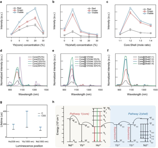图1. (a-c) 可见光区域发光增强;(d-f) NIR区域发光增强;(g)荧光寿命变化图;(h) CSS NPs中的能量转移机制和发光增强机理图。