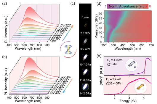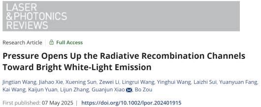 近日,博彩App 高压与超硬材料全国重点实验室邹勃教授团队肖冠军教授等人在全无机非铅金属卤化物的压强诱导发光研究中取得重要进展,通过高压打开了辐射跃迁通道,实现了一维金属卤化物Cs2AgI3“无光”到“有光”的反常压强诱导PIE行为(Pressure-Induced Emission, PIE),产生了高压下的高品质明亮白光发射,并深入揭示了背后的物理机制,推动了压力传感、压力开关和高压极端条件下的特种照明与显示应用。相关研究成果以“Pressure Opens Up the Radiative Recombination Channels Toward Bright White-Light Emission”为题发表在《Laser & Photonics Reviews》上。
