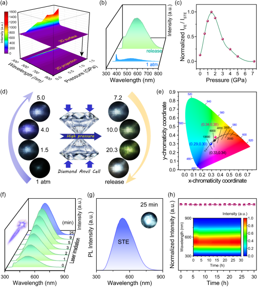本研究在实现PIEgens材料高效发光的常压截获同时,进一步通过高压工程策略设计了具有抗光漂白特性的高效稳定单组分白光发射,显著增强了其在固态照明和显示方面的应用潜力。