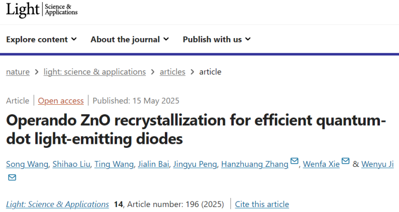 谢文法教授和刘士浩副教授等人,系统研究了老化过程中酸及金属对ZnO NPs薄膜形貌及光电特性的影响,通过系列原位表征,揭示了基于ZnO纳米粒子薄膜的杂化QLED器件正老化效应的机制。研究发现,酸的作用是诱导了ZnO NP的原位重结晶过程。具体来说,在酸的作用下,ZnO NP发生原位融合(再结晶),此种融合是沿着氧化锌晶体c轴方向,最终形成长程的ZnO晶体,并且粒子的缺陷得到一定程度的钝化。活性金属离子(如Al和Ag离子)从阴极到ZnO中的扩散对ZnO的再结晶起到促进作用,同时进一步钝化了ZnO粒子中的缺陷。最终,重结晶后的ZnO NP薄膜的载流子浓度得到了降低,而电子迁移率得到了极大提高。高的电子迁移率保证了高效的电子注入,而低的载流子浓度抑制了载流子对量子点中激子的猝灭作用。此外,ZnO的陷阱态被钝化,也显著抑制了其对激子的猝灭作用。最终,基于ZnO NP的红色QLED的外量子效率(EQE)从17.2%提升至33.7%。这一结果为QLED电子传输层的优化设计提供了指导。相关结果发表在Light: Science & Applications 期刊上。