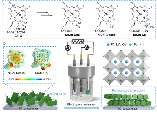 该工作在天然叶绿素a的基础上,设计了三种镍基叶绿素衍生物(NiChls),并采用电化学聚合方法制备出对应的聚合薄膜,成功构建出一类无需掺杂的空穴选择层材料。其中,基于NiChl-Deoxo的 PSC实现了创纪录的21.8%的效率,填充因子为 83.8%,这是迄今为止报道的基于叶绿素的钙钛矿太阳能电池的最高效率。此外,这些设备表现出卓越的长期稳定性。这项研究强调了分子修饰在推进叶绿素基材料方面的有效性,并为开发用于下一代钙钛矿太阳能电池的高性能、无掺杂剂HSL提出了一条有希望的途径。