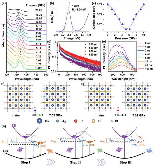 关于Bi离子掺杂无铅卤化物双钙钛矿的发射起源的争论主要是由于缺乏发射性质和结构之间清晰的构效关系。相关研究表明Bi3+的发光对Bi3+的配位多面体结构高度敏感,这主要源于Bi3+孤对电子(6s2)易受周围晶格结构影响,从而对3P0,1,2-1S0跃迁发光产生扰动。与此同时,电子与空穴复合发光中心与宿主材料的电子结构高度相关。尽管温度依赖的发射光谱已被广泛用于研究胶体量子点中的非辐射弛豫过程和激子-声子耦合。然而,Bi3+离子发射和自陷态激子发射的相近性,不利于区分Cs2AgIn0.9Bi0.1Cl6纳米晶的光物理机制。高压作为一种独立温度和组分新维度,能够有效调控材料晶体结构和电子态,成为解决常压下科学争议行之有效的重要实验手段之一。
