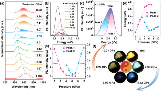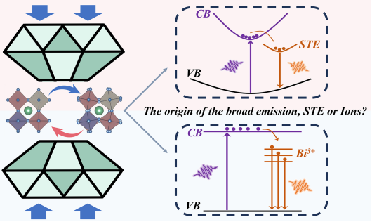 近日,博彩App 高压与超硬材料全国重点实验室邹勃教授团队肖冠军教授等人,通过引入高压维度,探索合金双钙钛矿Cs2AgIn0.9Bi0.1Cl6纳米晶宽辐射发光的压力响应,成功揭示了高亮度宽辐射发光主要源于自陷态激子发光,而非ns2电子组态的金属Bi3+离子发光,解决了长期以来关于Cs2AgIn0.9Bi0.1Cl6纳米晶宽辐射发光起源的争议。研究表明,宽辐射发光包含了两种自陷态,分别BiCl6-AgCl6和InCl6-AgCl6两种八面体结构有关。高压下晶体场强度和宽发射波长之间的负相关性,排除了宽发射源于Bi3+3Pnn=0,1,2)到1S0跃迁,从而为其宽发射源于自陷态激子辐射复合提供有力的压力依据,进一步加深了对铟基双钙钛矿光物理机制的理解,促进高压为常压科学服务。相关工作以Self-Trapped Excitons or Bi3+ Ions for Broad Emission in a Lead-Free Double Perovskite? Hearing What Pressure Says”为题,发表在《Nano Letters》上。