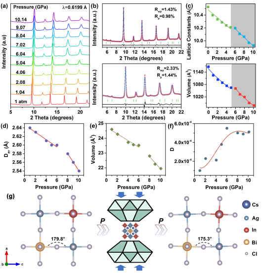 具有ns2电子组态Bi3+金属离子掺杂,打破了Cs2AgInCl6晶格的反演对称性,导致从宇称禁戒跃迁到光学允许的带边跃迁转变。由于双钙钛矿低电子维度的固有性质,使得吸收谱呈现类分子结构的尖锐吸收峰。Rietveld结构精修和密度泛函理论计算表明,随着压力的增加,AgCl6InCl6BiCl6八面体表现出持续的收缩。然而,当施加的压力超过6.04 GPa时,顶角相连的BiCl6八面体呈现垂直于[010]方向的轻微旋转,导致相邻AgCl6八面体的相反方向上的倾斜。而高压下Cs2AgIn0.9Bi0.1Cl6纳米晶内卤化物八面体的局域畸变对于发射峰的劈裂具有主要贡献和作用。