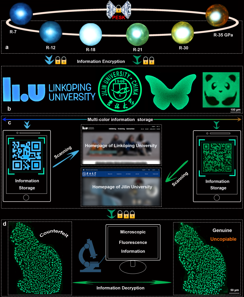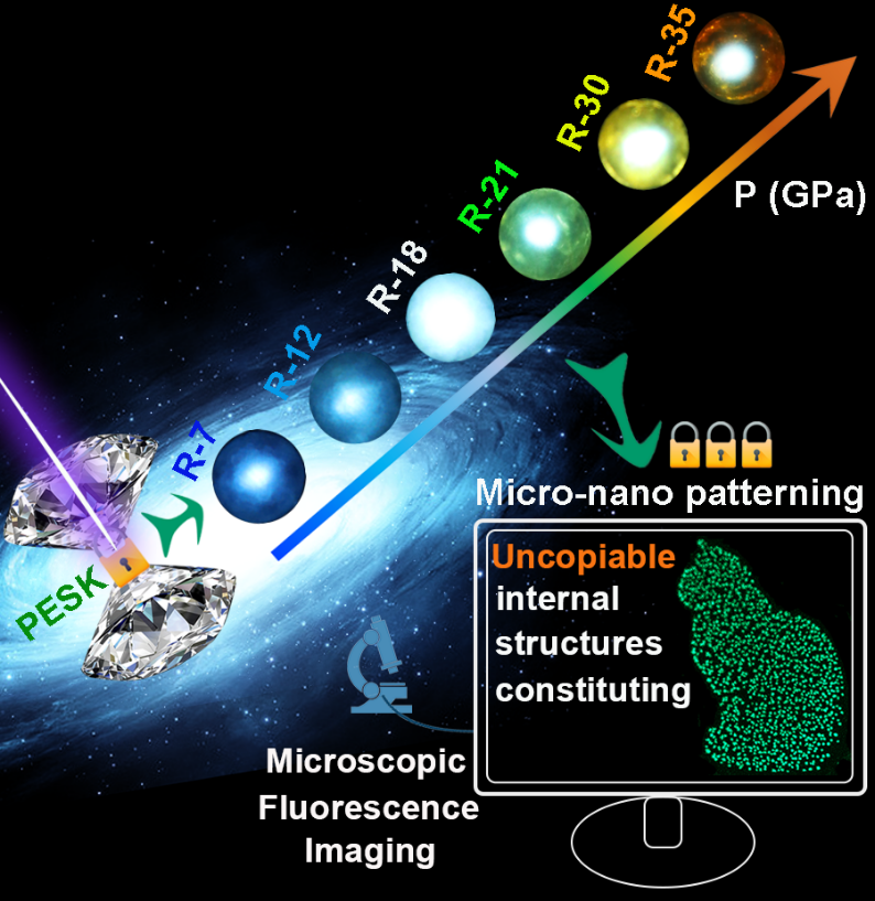 张立军教授、瑞典林雪平大学高峰教授,在压强诱导发光的常压截获及光学加密防伪研究取得重要进展。研究团队利用压力工程调控杂化金属卤化物材料的局域激发态和电荷转移态,成功实现了涵盖可见光范围由红到蓝的多色动态调控。该研究创造性提出了“压强工程密钥”(Pressure Engineering Secret Key, PESK)概念,将压强作为光学防伪的独特密钥,通过建立亚稳态材料光学特性与压强条件的精确对应关系,构筑了多级物理不可复制的新型加密防伪体系。本研究不仅为光学防伪技术拓展了新维度,大大增强了裸眼识别与可视化信息加密能力,更显著提升了防伪系统的安全等级。相关研究成果以“Pressure Encryption Toward Physically Uncopiable Anti-Counterfeiting”为题,发表在《自然·通讯》上(Nature Communications, 2025, 16, 6203)。