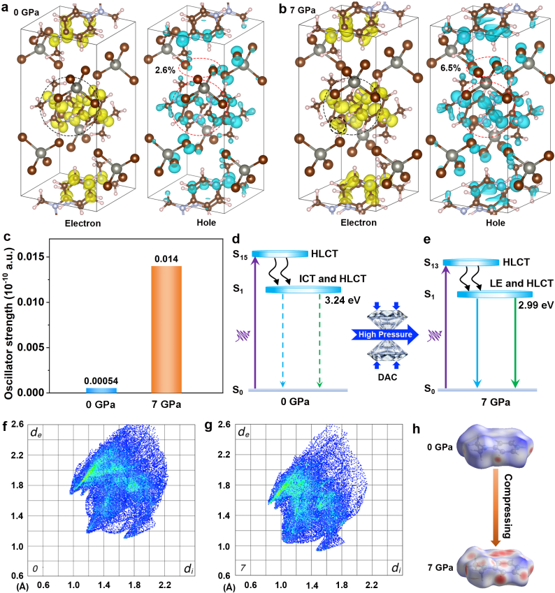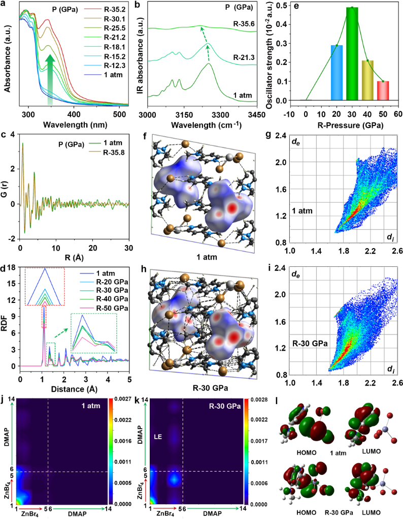 图3、不同压强处理(4DMAP)2ZnBr4后的吸收光谱、红外光谱、振子强度、径向分布函数、Hirshfeld表面分析和跃迁密度矩阵。