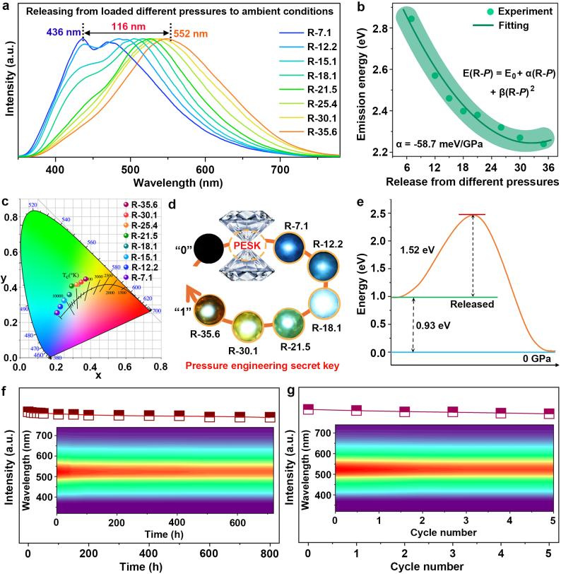 本研究设计并高压合成了一种新型低维有机-无机杂化金属卤化物材料(4DMAP)2ZnBr4,该材料巧妙整合了有机和无机组分的发光特性。值得注意的是,该材料在常压下呈现“暗态”特征(发光极弱),而通过精确压力调控可激活其多色发光特性。实验研究表明,在不同压强刺激下,实现了(4DMAP)2ZnBr4从初始不发光的“暗态0”到高压下及卸压后发光的“亮态1”的开光行为转变,发射颜色呈现连续可调的渐变特征,覆盖深蓝至橙红的宽色域范围。本研究首次提出了“压强工程密钥”(Pressure Engineering Secret Key, PESK)的新概念,为先进光学加密技术开辟了新途径:通过精确控制压强参数来调控材料中不同发射峰的比例,实现了单一材料的多色压强诱导发光(PIEgens)。