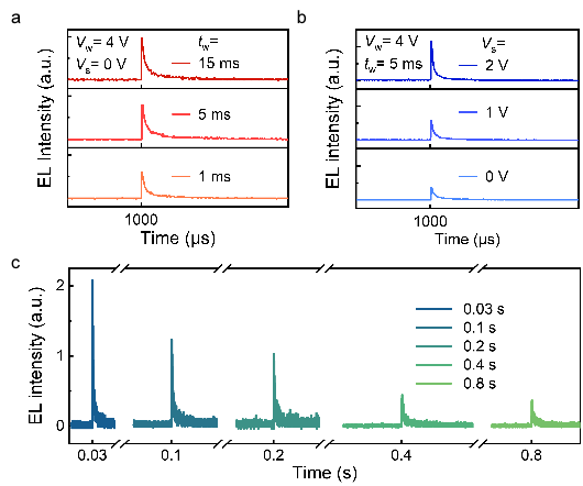Figure 4. EL spike of the QLED at various (a) driving durations, tw and (b) standby voltage Vs. All the signals are recorded at ts = 1000 µs. (c) EL spike of the QLED at different times after turning off the driving voltage, ts.
