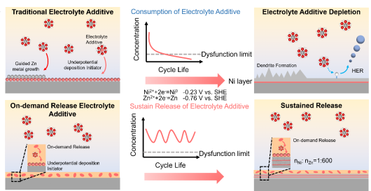 目前,针对锌阳极稳定性的改性策略主要包括电解液添加剂调控以及合金化处理。然而,这些方法在长期运行中仍存在局限。一方面,电解液添加剂在短期内能够通过静电屏蔽、优先吸附和溶剂化结构调控等方式改善锌沉积均匀性,但随着循环进行,添加剂逐渐消耗,会导致电池性能下降,难以维持长周期的稳定性。另一方面,合金化策略虽可精确调控锌的成核与生长,并提高耐腐蚀性,但传统合金体系往往缺乏灵活性,对不同金属离子的调控效果存在局限,且难以同时兼顾成核均匀性和界面长期稳定性。因此,如何在长期循环条件下保持添加剂或金属调控效果,实现锌阳极的持续均匀沉积与耐腐蚀保护,仍是关键挑战。