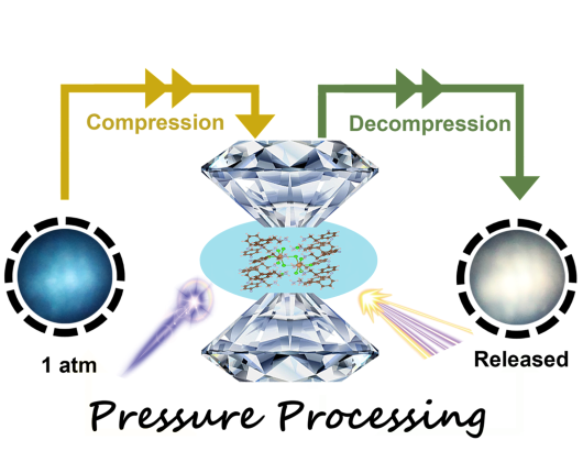 金属卤化物二聚体的结构特性为调控零维杂化金属卤化物光电性能提供了更多机会。因此,我们选取零维锑基二聚体杂化卤化物钙钛矿材料为研究对象,利用高压手段,在不改变化学组分的前提下,调控其结构属性进而优化其发光特性,并进一步基于空间位阻效应提高相变势垒,成功截获白光发射至常压。本研究为有机-无机杂化金属卤化物材料中有机和无机组分协同发光的调制提供了新的视角,为开发高质量的单组分白光发射体提供了新的研究手段。