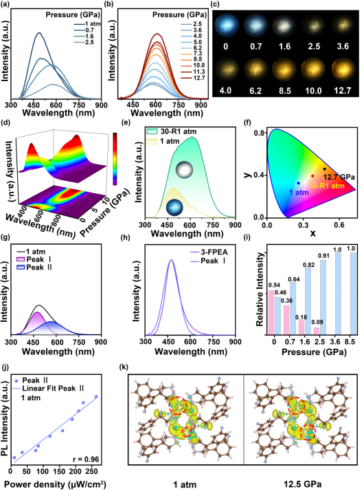 高压与超硬材料国家重点实验室肖冠军教授等人在零维无铅有机-无机杂化金属卤化物材料[3-FPEA]6(Sb2Cl10)*2Cl的高压发光调控研究中取得了进展。实现锑基杂化金属卤化物[3-FPEA]6(Sb2Cl10)*2Cl压强诱导发光的同时,还实现了单组分白光发射的常压截获,主要归因于有机阳离子构的空间位阻提高相变势垒,进而导致卸压不可逆。此外,高压下样品表现出从蓝光发射到黄光发射的显著压致变色,这与压力下有机组分向无机组分的能量转移有关。相关研究成果以“Pressure-Induced Emission Luminogens from Antimony Chloride Dimers toward White-Light Emission Harvesting”为题发表在《Laser & Photonics Reviews》上。