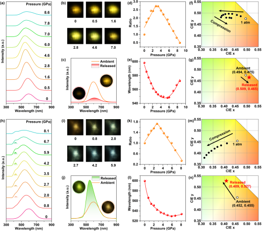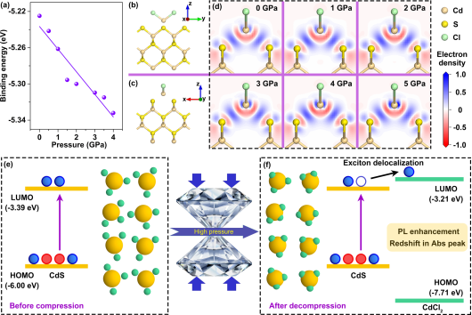 固态照明技术凭借其极高的光电转换效率和长寿命等优势,成为推动绿色低碳照明发展的关键力量。当前,开发新型半导体材料是实现更高能源利用率、推进可持续发展的重要途径。在众多材料中,量子点因其高发光效率、低生产成本和广色域覆盖能力,正逐步取代传统LED,占据市场主流。由于尺寸微小,量子点具有高比表面积,导致其物理化学性质强烈依赖于表面态的调控。通常情况下,表面原子因配位不饱和而形成大量悬挂键,进而显著降低量子点器件的性能。压强作为一种独立于温度和组分的热力学参量,能够有效缩短原子间距、调控材料的电子结构,为物质科学研究提供了新的维度和手段。在前期研究中,邹勃教授团队肖冠军课题组通过对CdSe量子点施加压力,有效增强了配体对表面无辐射缺陷的钝化作用,使其荧光强度提升了一个数量级以上(J. Am. Chem. Soc. 2018, 140, 13970−13975)。2024年,该团队进一步利用不同类型配体对CdS进行表面钝化,在高压下实现了其本征发光与缺陷发光的选择性增强,并最终获得白光发射,也为通过高压研究指导常压合成,进而服务常压科学奠定基础(CCS Chem. 2025, 7, 160–169)。2025年,该课题组系统研究了高压下不同配体包覆量对CdS光学性能的影响,在同一材料与选择性配体复合体系中,分别实现了从橙光到白光以及从橙光到蓝紫光的两类压致变色调控(Laser Photonics Rev. 2025, 19, 2401971)。