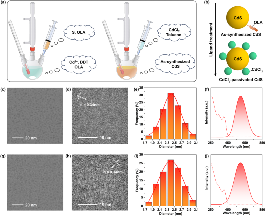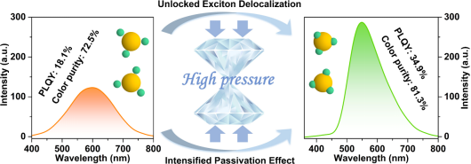 高压与超硬材料全国重点实验室肖冠军教授等人在传统CdS量子点表面缺陷态的压力调控研究中取得重要进展。研究团队通过选择结合力更强、配位位点更丰富的原子配体CdCl2,成功合成新型包覆结构的CdS量子点。高压处理进一步强化了量子点与配体之间的相互作用,有效修饰了其表面态,促使激子向量子点表面离域扩展。压力有效优化了CdS–CdCl2界面,促进激子离域与表面钝化效应,从而显著提升了发光性能。该研究为拓展量子点材料在光电子学领域的应用提供了新颖的设计思路与理论依据。相关研究成果以“Enhanced Excitons Delocalization Toward High-Quality Emission Harvesting Unlocked by Pressure and Ligand Engineering”为题发表在《Nano Letters》上。