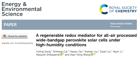 新型电池物理与技术教育部重点实验室王晓峰教授团队宽带隙钙钛矿太阳能电池研究方面取得重要进展,相关成果以“A regenerable redox mediator for all-air processed wide-bandgap perovskite solar cells under high-humidity conditions”为题发表在国际权威期刊《Energy & Environmental Science》上。