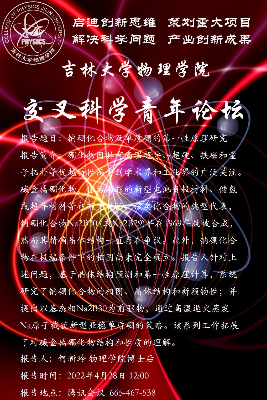 硼化物因具有高温超导、超硬、铁磁和量子拓扑等优越特性而受到学术界和工业界的广泛关注。碱金属硼化物,作为潜在的新型电池负极材料、储氢或超导材料等也颇受关注。该类化合物的典型代表,钠硼化合物Na2B30 (或Na2B29)早在1969年就被合成,然而其精确晶体结构一直存在争议。此外,钠硼化合物在极端条件下的相图尚未完全确立。报告人针对上述问题,基于晶体结构预测和第一性原理计算,系统研究了钠硼化合物的相图、晶体结构和新颖物性;并提出以基态相Na2B30为前驱物,通过高温退火蒸发Na原子截获新型亚稳单质硼的策略。该系列工作拓展了对碱金属硼化物结构和性质的理解。