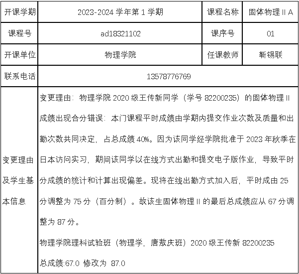 根据《关于进一步明确本科生课程考核等有关问题的通知》(校教字[2018]47号)文件有关精神,现对一下课程成绩更正进行公示: