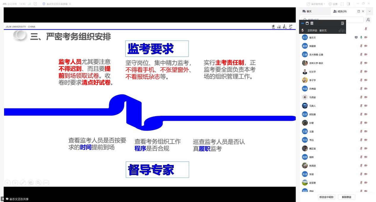 的优良传统,考核工作是教育教学的重要一环,营造风清气正、诚信为本的考试环境有利于激发学生的学习动力。随后,崔志文对期末考试工作作了整体的部署和要求,他从考前工作布置、科学命题、考务组织安排、狠抓考风考纪、评阅试卷、成绩复查等方面详细解读了该项工作的全过程。最后,与会教师就如何履行考务工作规范、如何处理各类突发情况等细节问题进行了交流研讨。