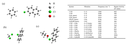 为了进一步阐明增强机制,作者通过密度泛函理论(DFT)模拟计算了1-CN与各溶剂形成复合物的拉曼活性。结果表明:在1-CN–乙醇复合物中,C=C骨架伸缩振动模式(1370 cm⁻¹)的拉曼活性升至3842 Å⁴/amu是纯1-CN的六倍,与实验结果高度一致。