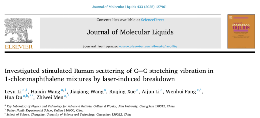 2022级本科生(中外合作办学)李乐宇等人在门志伟教授的指导下,在1-氯萘(1-CN)混合溶液体系受激拉曼散射(SRS)增强机制研究方面取得重要进展。研究成果以“Investigated stimulated Raman scattering of C=C stretching vibration in 1-chloronaphthalene mixtures by laser-induced breakdown”为题发表于《Journal of Molecular Liquids》上(DOI: 10.1016/j.molliq.2025.127961)。