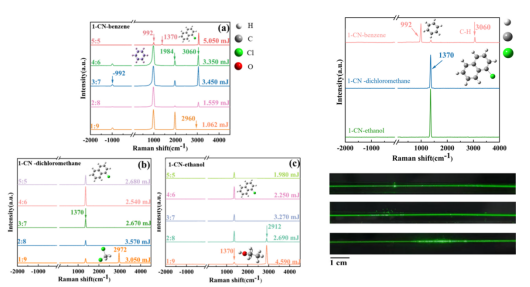 该研究聚焦于C=C伸缩振动受激拉曼散射行为,系统探索了1-CN在苯、二氯甲烷、乙醇三种不同溶剂中的SRS增强现象。在1-CN–乙醇体系中,C=C骨架伸缩振动模式表现出显著增强,基于激光诱导击穿(LIB)与等离子体形成规律,揭示了乙醇分子可以降低溶液LIB阈值,更易形成中性分子复合物并激发强SRS信号。