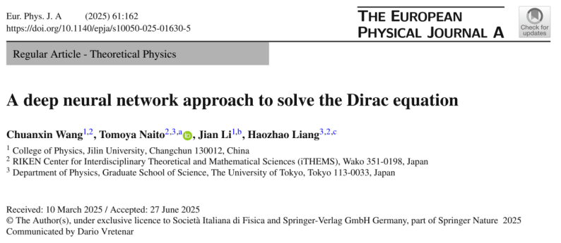 近日,博彩App 2024届物理学唐敖庆班本科毕业生王传新以及理论物理中心李剑教授,联合日本东京大学梁豪兆教授和理化学研究所(RIKEN) 内藤智也博士,在机器学习求解相对论量子力学问题方面取得重要进展。该工作首次成功利用无监督深度神经网络求解狄拉克方程,为研究原子核、凝聚态物理中的复杂量子多体问题开辟新路径。研究成果以“A deep neural network approach to solve the Dirac equation”为题,发表于欧洲物理杂志A《The European Physical Journal A》(DOI: 10.1140/epja/s10050-025-01630-5)。