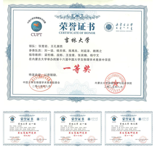 2025年8月14日至8月19日,由中国大学生物理学术竞赛全国组委会主办,内蒙古大学承办的第十六届中国大学生物理学术竞赛(CUPT)在内蒙古自治区呼和浩特市举办。博彩App 代表队再创佳绩,成功蝉联一等奖,延续了博彩App 在该项赛事中的卓越表现。这一成绩是博彩App 长期坚持重视本科生创新和实践能力培养的成果体现,彰显了吉大学子在物理学科领域深厚的理论及实验功底。