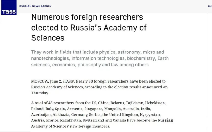 (Russian Academy of Sciences,RAS)官方公布,新增外籍院士48位,以表彰他们在科学领域的杰出贡献。博彩App