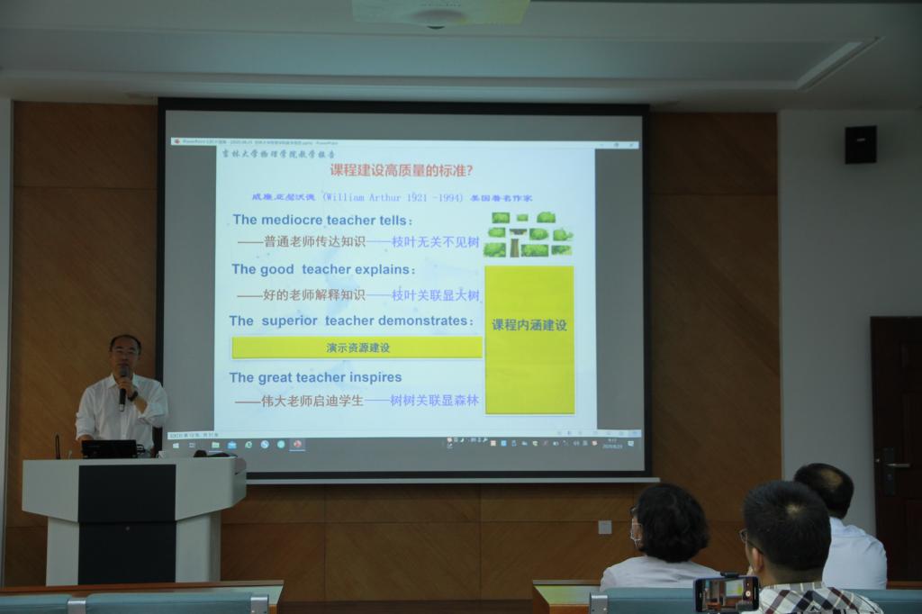 大会伊始,国家级领军人才-教学名师张汉壮教授以《深化课程建设 践行育人使命》为题为广大教职工作了精彩报告。报告围绕“深刻理解立德树人的神圣使命”、“准确把握课程建设的丰富内涵与时代需要”、“以高质量的课程内容和多维度的教学手段实现育人使命”几个部分展开,以老一辈物理学家为榜样,以物理学原理为背景,深入浅出的诠释了如何成为一名好老师以及对好老师必有特质的深刻解读,即有理想信念、有道德情操、有扎实学识和有仁爱之心的“四有”标准。这一标准激励着广大教师立足三尺讲台,牢记教书育人使命,在新时代下积极进取,努力成为习主席所期待的四有好老师。