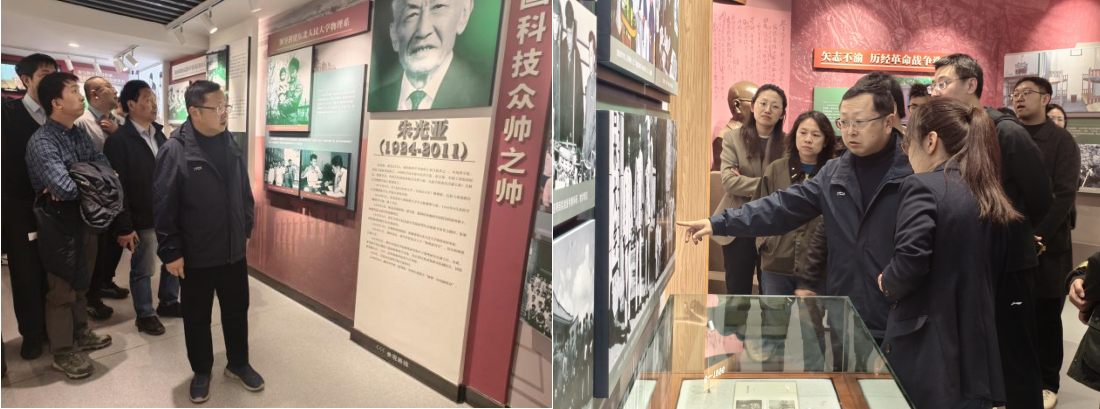 在物理学科先贤专属展陈区域,全体人员久久驻足、凝神瞻仰,深切感受物理人的赤子情怀与使命担当。余瑞璜同志白手起家、筹建物理系,以坚韧之志诠释学科奠基的开拓者本色;朱光亚同志自朝鲜战场归来后倾心投身物理学科建设,以战略远见为国家培育栋梁之才;吴式枢开创理论物理、核物理研究新领域,芶清泉深耕原子与分子物理前沿,高鼎三开拓半导体学科新方向……一代代物理学者薪火相传、潜心笃行,以“功成必定有我”的责任担当,在艰苦卓绝中筑就学科根基,在砥砺奋进中书写学术华章,其师者风范与治学精神令人感佩不已