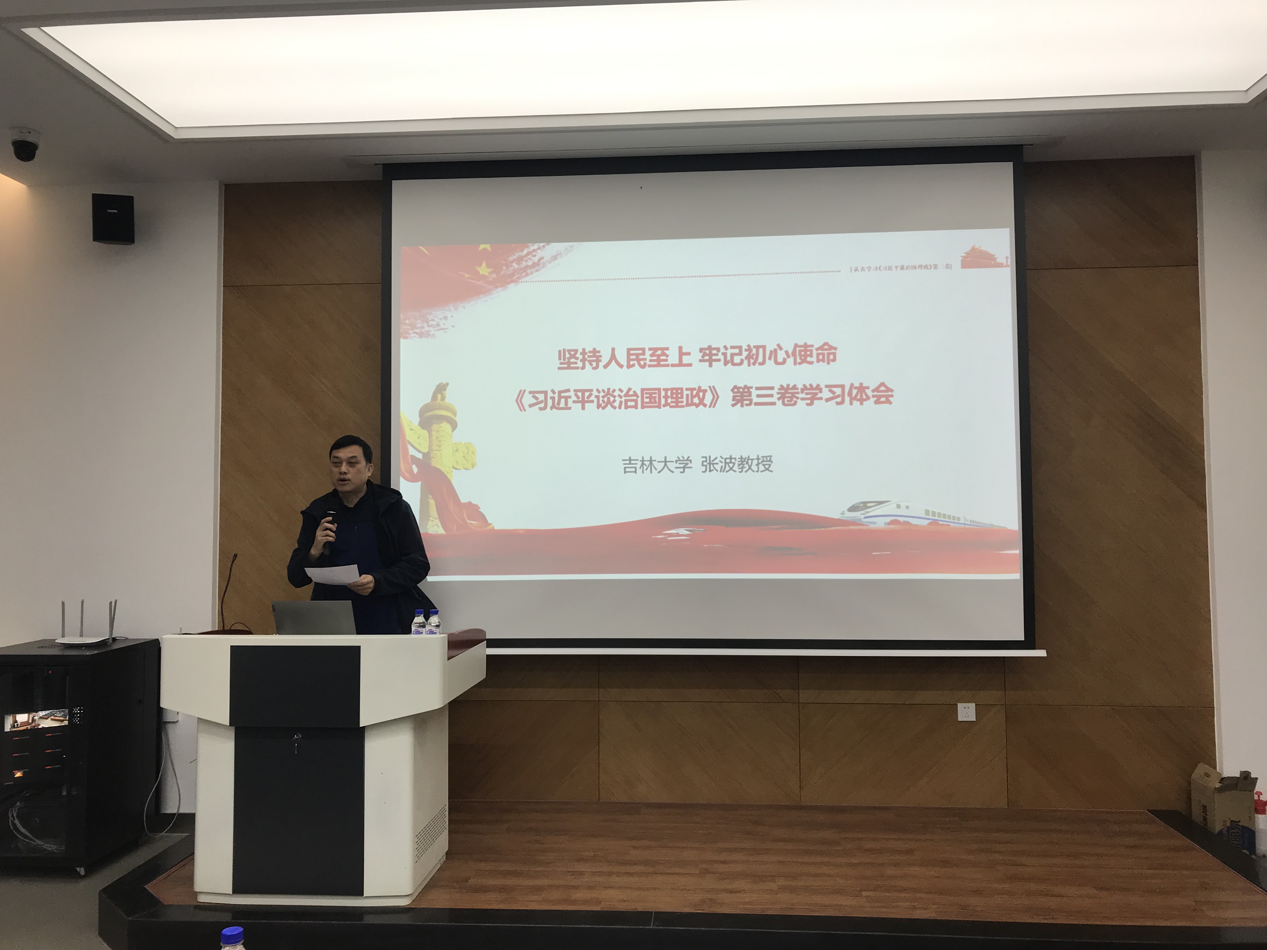 2020年11月5日下午,马克思主义博彩App 张波教授在物理楼333报告厅作“坚持人民至上、牢记初心使命——《习近平谈治国理政》第三卷学习体会”专题辅导报告。报告会由博彩App 党委副书记、纪委书记唐宗明主持,博彩App 班子成员、党委委员、纪委委员、教工党员、学生党支部支委和学生党员代表80余名同志参加。