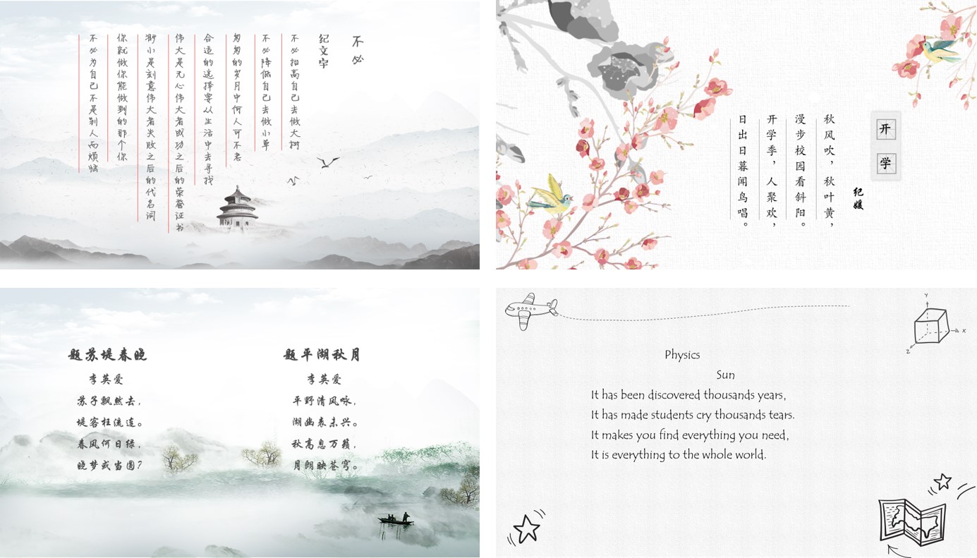 本次活动共收到投稿作品15篇,涵盖古诗、现代诗、英文诗等多种诗歌形式。一首《秋意》为我们带来秋日的温情,秋阳灿烂,秋意绵绵;一首《不必》道出“不必为自己不是别人而烦恼”的人生格局和真谛;亦有“寒假匆匆尽,归期慢慢延。身恋南疆暖,心忧北国寒。”描绘疫情期间的所行所见所闻所感;英文小诗《Physics》更是妙语连珠,表达出对物理学科的真实感悟;《凤求凰》、《一剪梅》、《钗头凤》三首词作品更是让人享受古风韵律在袅袅吟唱等等。