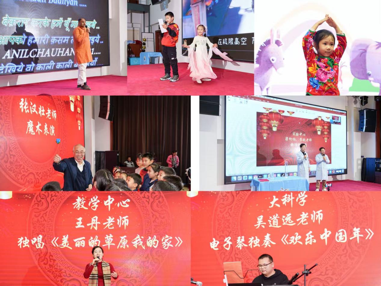 颁奖环节后,联欢会进入轻松愉快的文艺表演与互动阶段。吴道远老师以一曲热情洋溢的电子琴独奏《欢乐中国年》拉开表演序幕,瞬间点燃了全场的新春气息。王丹老师深情演唱《美丽的草原我的家》,悠扬的歌声仿佛将大家带入辽阔草原。随后,童趣盎然的歌伴舞登场,展现了博彩App 教职工家庭的温馨与活力。外教VINDY带来别具特色的英文独唱,以动人嗓音跨越语言,传递了节日祝福。