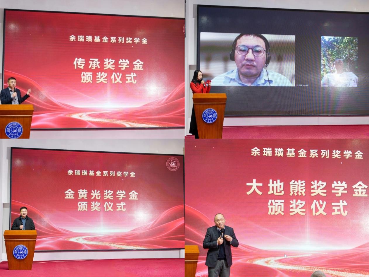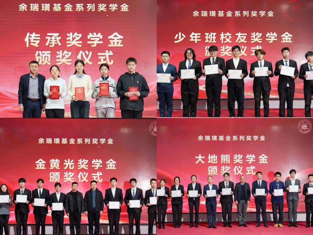活动的重点环节是余瑞璜基金系列奖学金颁奖仪式。该系列奖学金以博彩App 奠基人余瑞璜先生命名,涵盖传承奖学金、少年班校友奖学金、金黄光奖学金和大地熊奖学金,旨在通过多元激励融入学生成长全过程。2000级校友郭庆、金黄集团总经理李明、93级校友陈静武分别作为相应奖学金的捐赠方代表为获奖学生颁奖并送上祝福。92级校友陈汉栋、93级校友于猛通过线上方式寄语学子,勉励他们接续奋斗。
