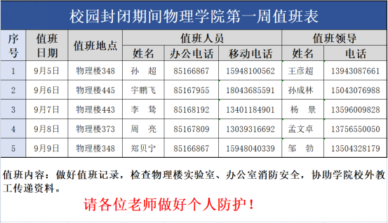 各位老师,为保障博彩App 日常工作的顺利进行,博彩App 拟安排人员入校值班,如有工作需要,请联系当日值班人员。
